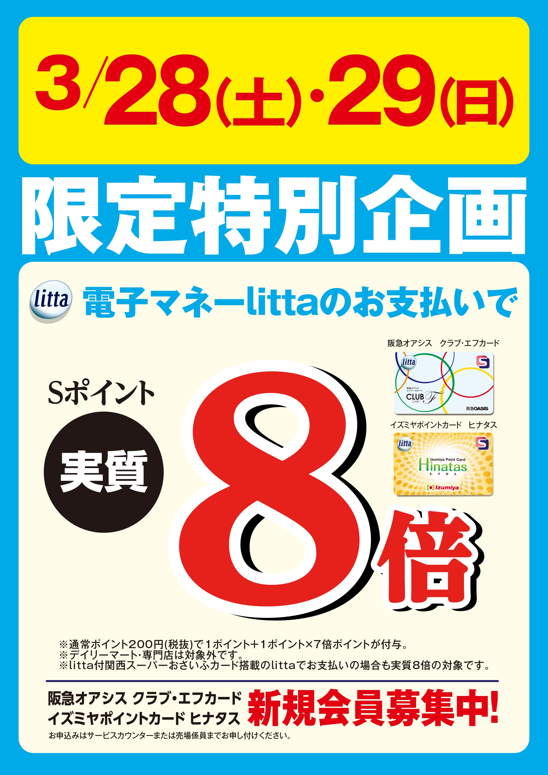 2026.03.23 キャンペーン 3月28日(土)・29日(日)限定特別企画!クラブ・エフカード、ヒナタスカード搭載 電子マネーlittaのお支払いでSポイント実質8倍! ※キッチン&マーケットルクア大阪店、阪急オアシスデイリーマート富田店・伊丹大鹿店・守口店は実施しておりません。 前の記事 次の記事 特集一覧へ戻る