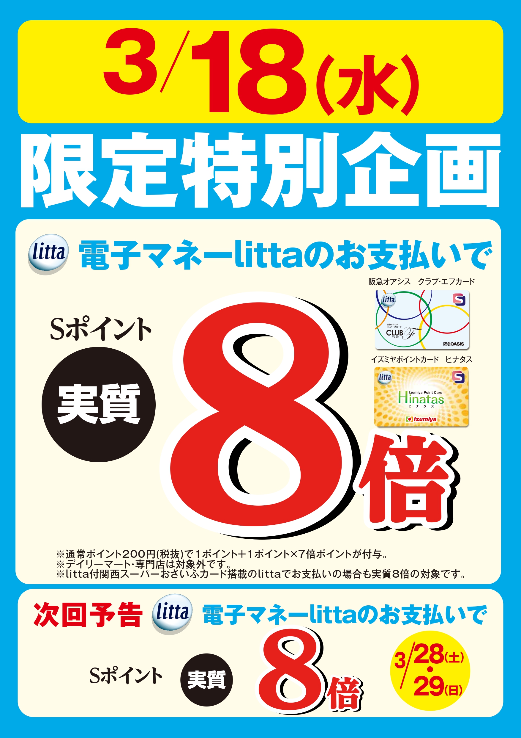 2026.03.16 キャンペーン 3月18日(水)限定特別企画!クラブ・エフカード、ヒナタスカード搭載 電子マネーlittaのお支払いでSポイント実質8倍! ※キッチン&マーケットルクア大阪店、阪急オアシスデイリーマート富田店・伊丹大鹿店・守口店は実施しておりません。 前の記事 次の記事 特集一覧へ戻る