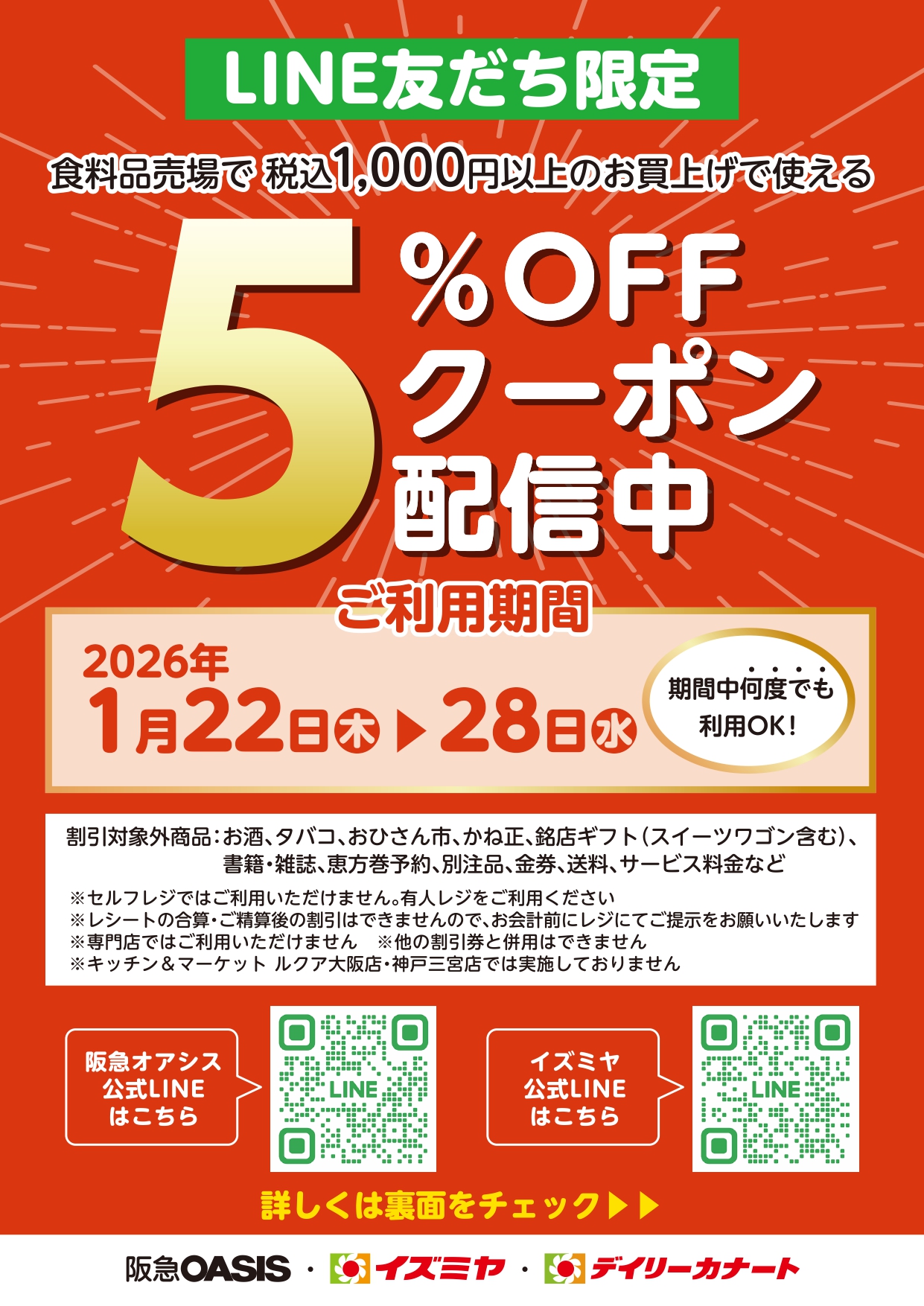 2026.01.15 キャンペーン LINE友だち限定 食料品売場で税込1,000円以上のお買上げで使える5%OFFクーポン配信中! ▼阪急オアシス公式LINEの友だち追加はこちらから▼ 前の記事 次の記事 特集一覧へ戻る