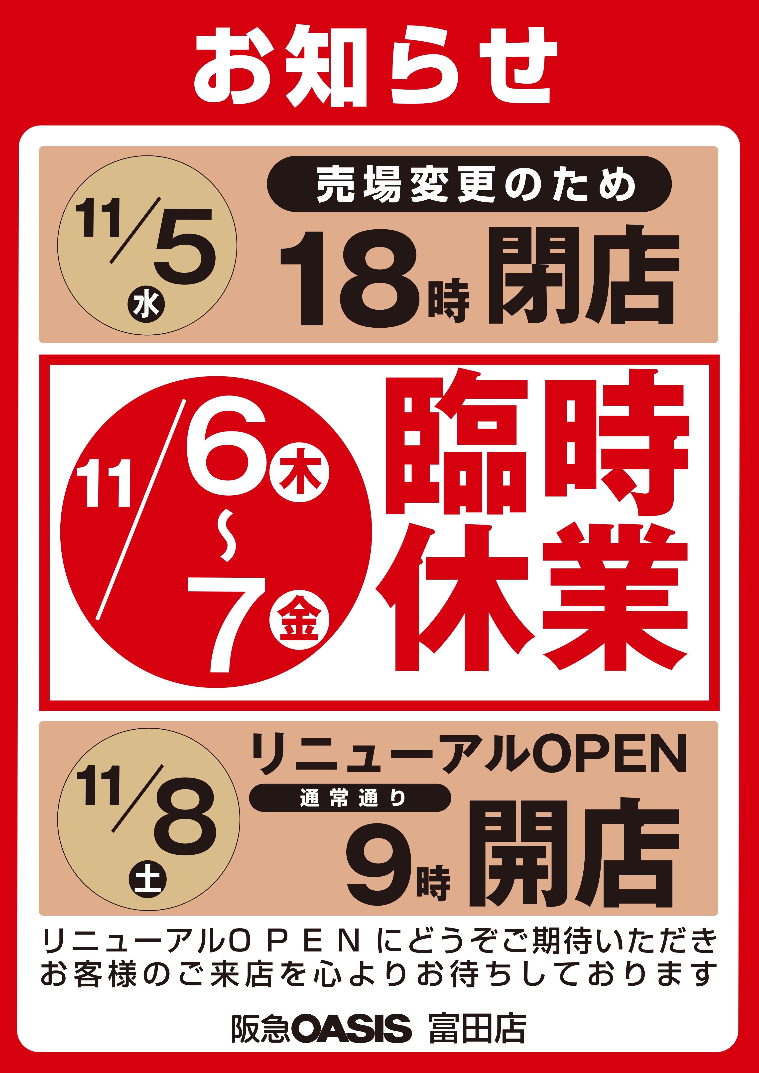 11月6日(木)~7日(金)富田店 臨時休業のお知らせ