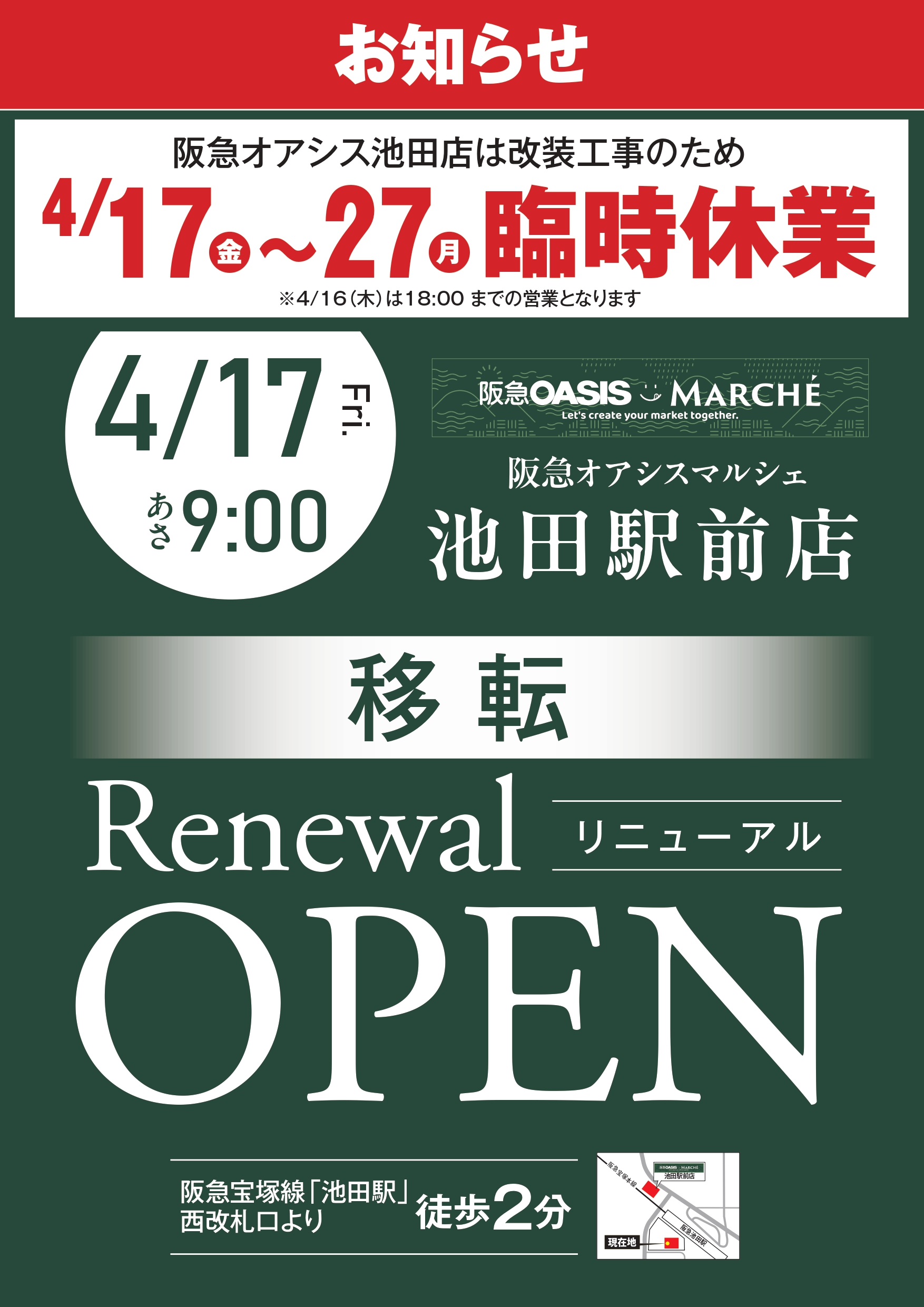 2026.03.30 「阪急オアシスマルシェ池田駅前店」 移転リニューアルオープンのお知らせ 阪急オアシス跡地にて、4/28(火)関西スーパーデイリーマート池田店が誕生します 次の記事 お知らせ一覧へ戻る