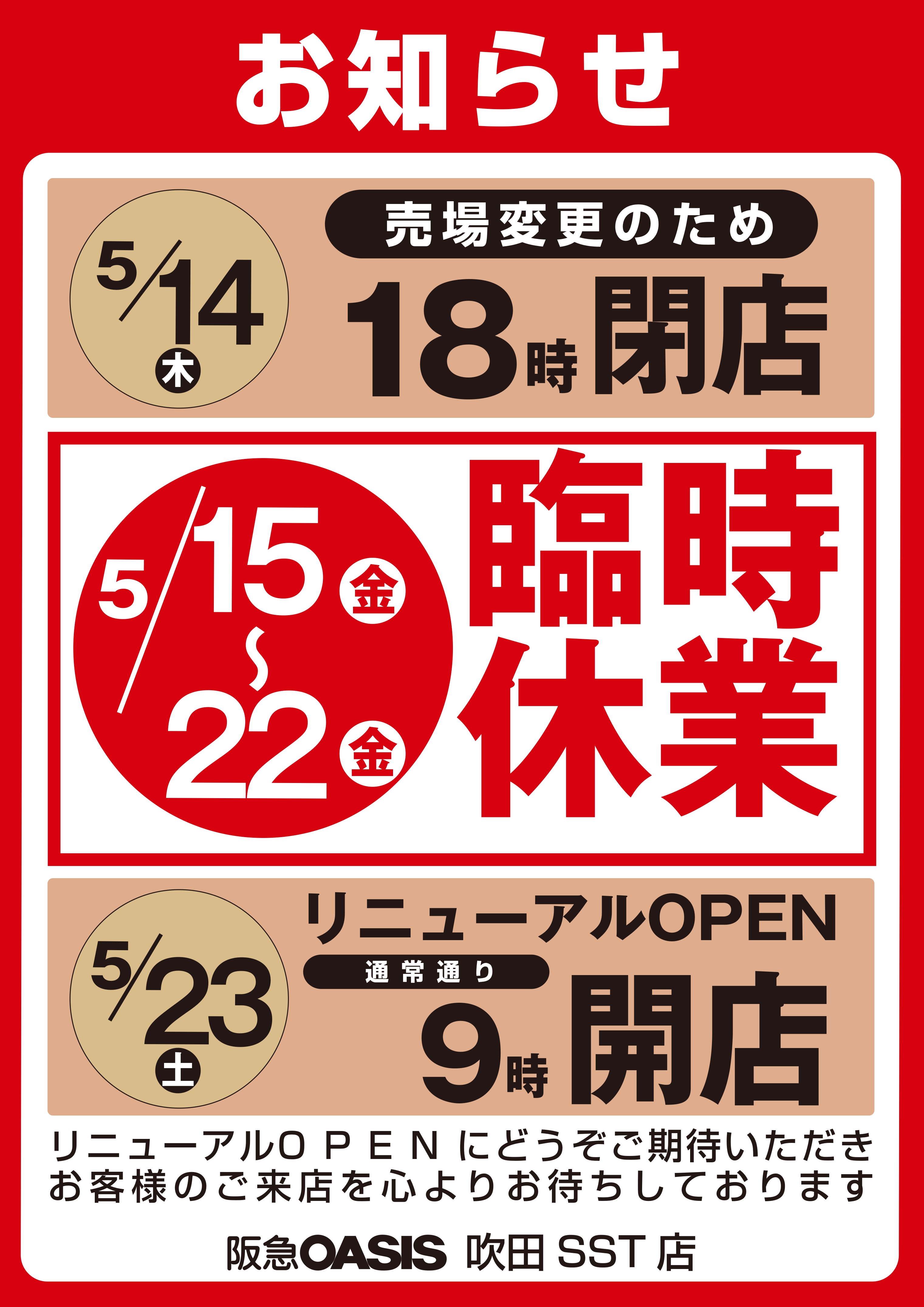 5月15日(金)~22日(金)吹田SST店 臨時休業のお知らせ